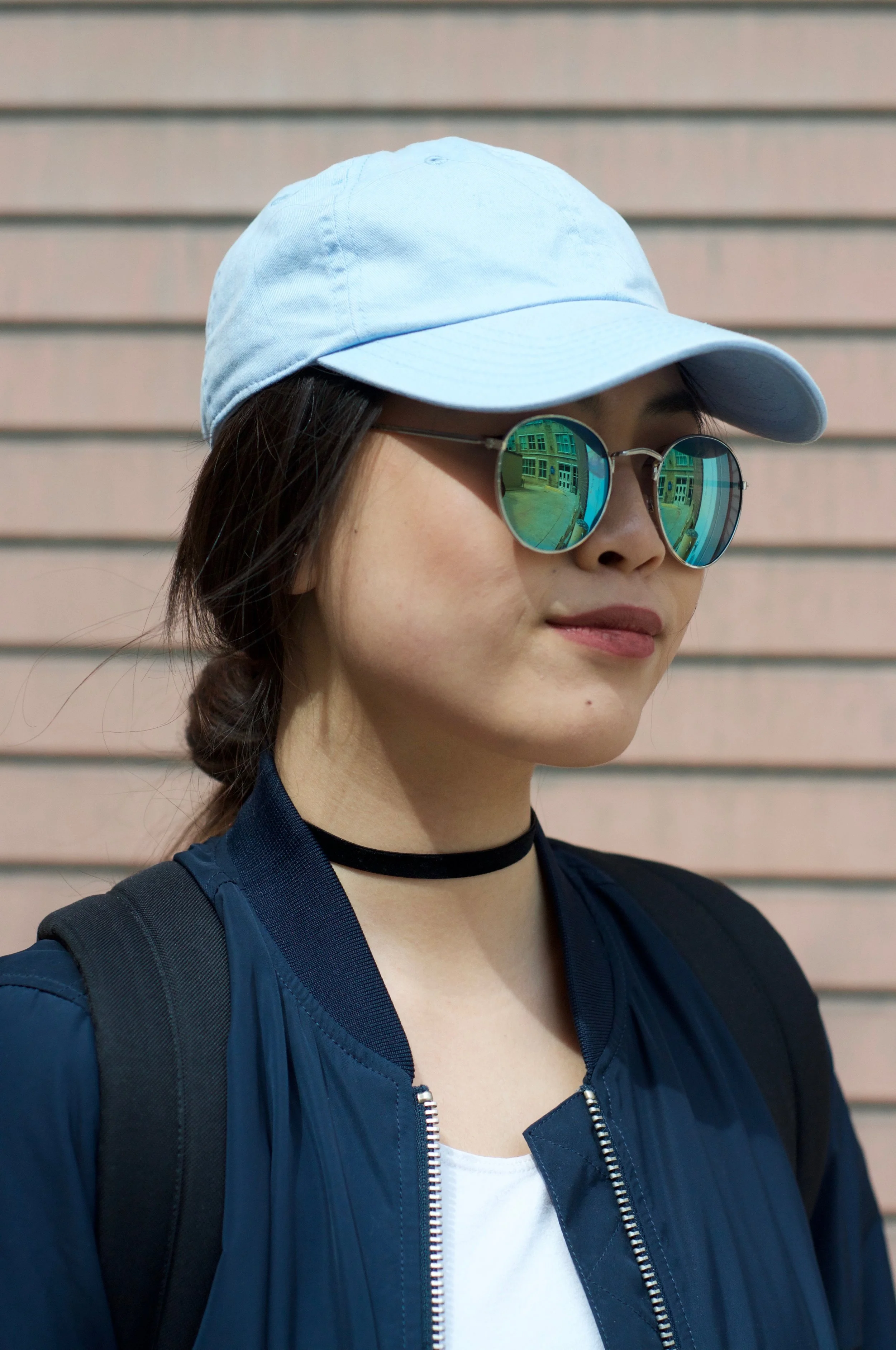 cap / sunglasses - urban outfitters | bomber jacket / bottom / shoes - topshop | top - american apparel | chocker - DIY w/ velvet black ribbon | backpack - herschel