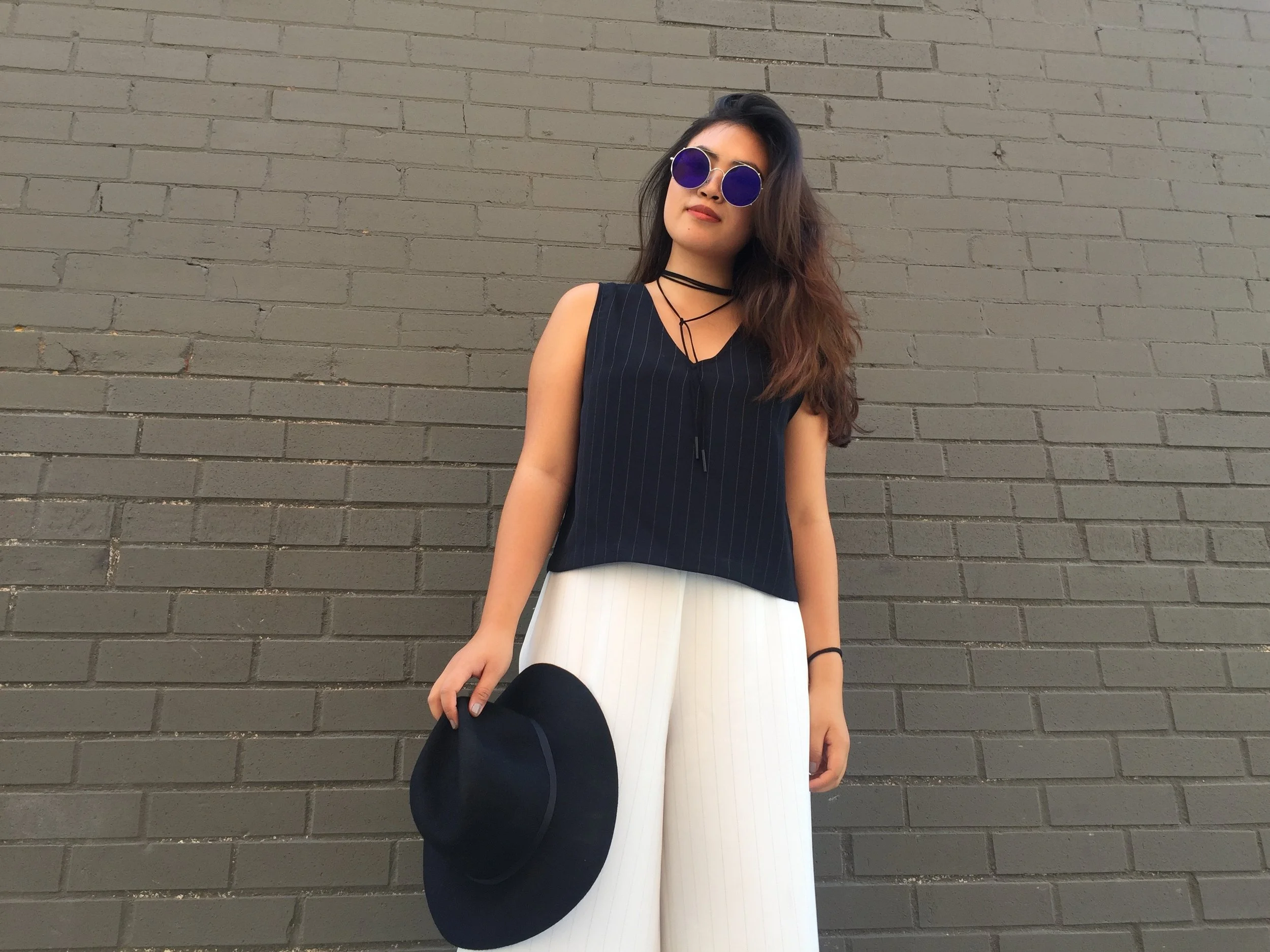 top and pants: oak + fort | leather jacket - michael kors | shoes and hat: topshop | choker: aldo | sunglasses: mendecino | bag: kate spade